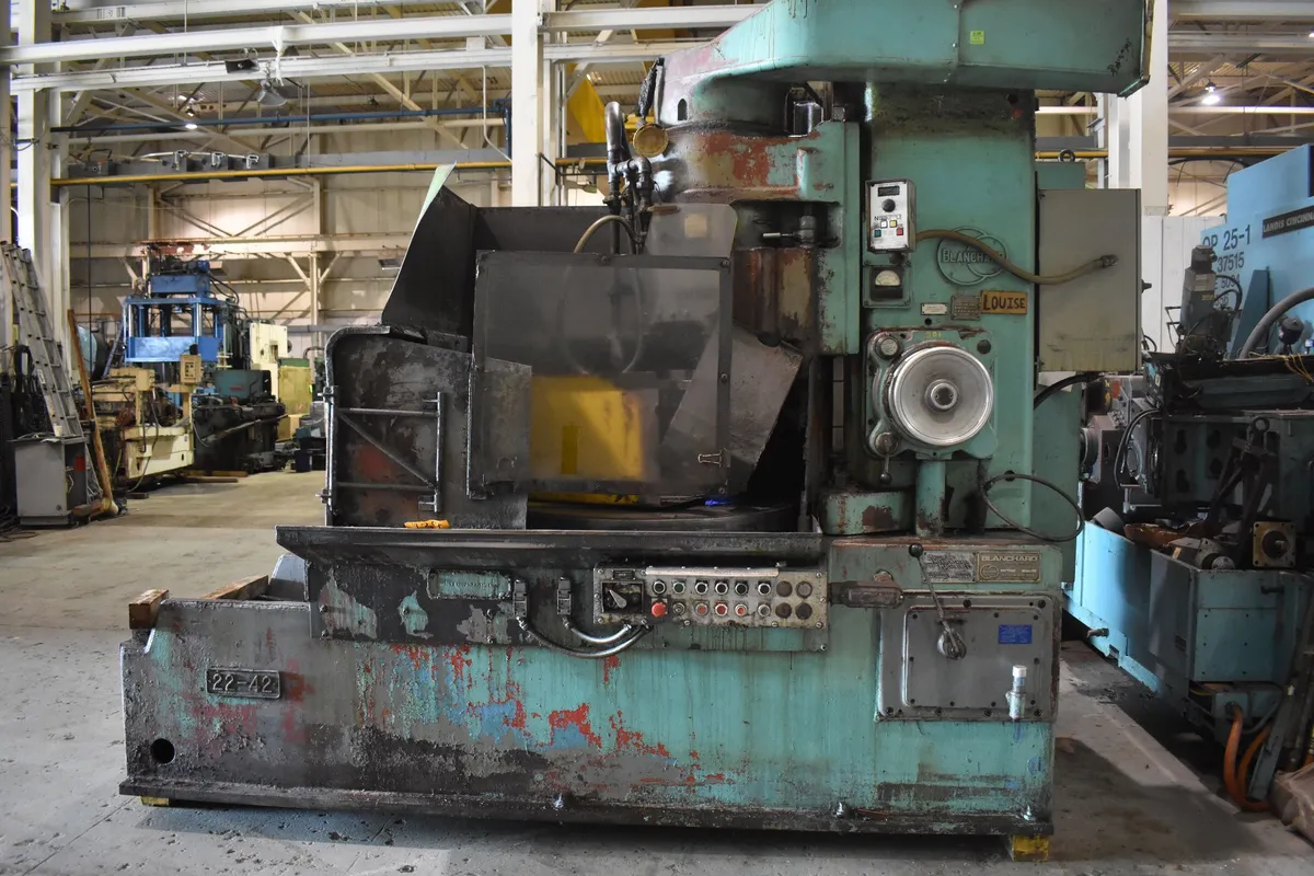 BLANCHARD 22-42 rotary vertical surface grinder, 1976 model, Features 42" chuck size, 50 HP power, 48" swing, 23" under wheel, 2.25" grinding wheel width, and 22" wheel diameter. Ideal for precision tasks.
