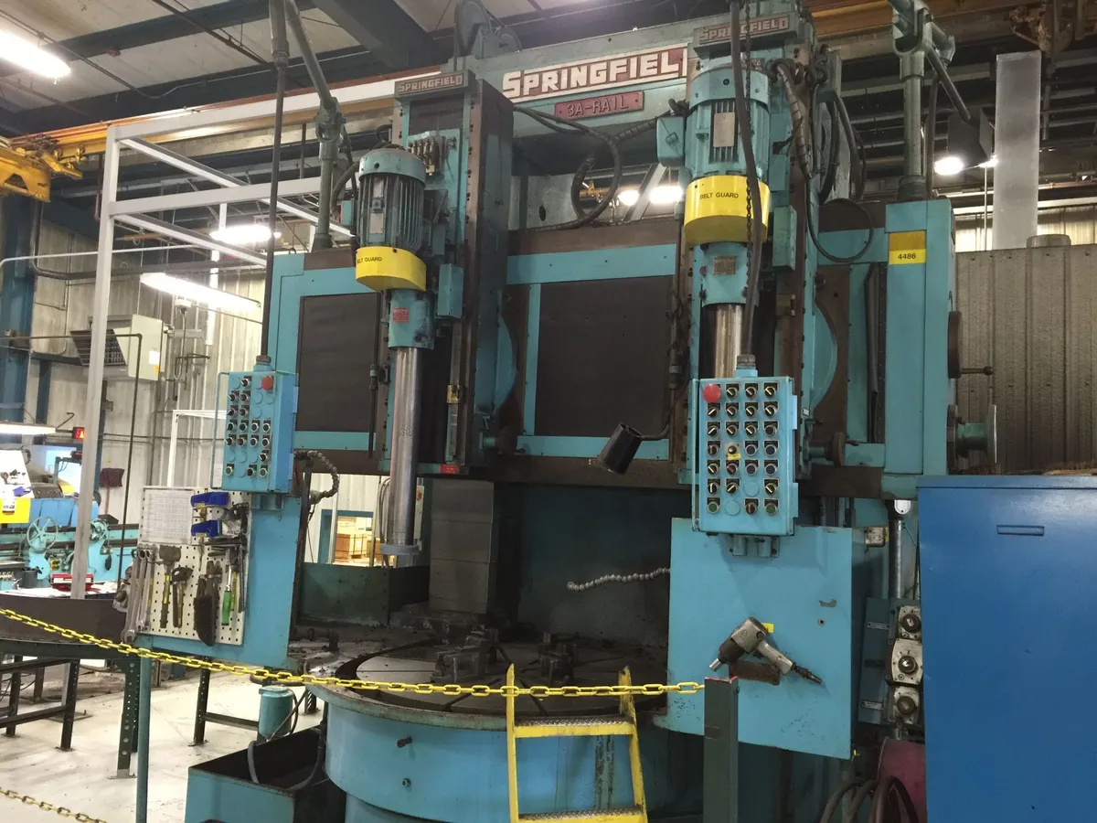 SPRINGFIELD 3A-TR RAIL TYPE Vertical Universal Grinder, used condition. Features a 62-inch table diameter, 71-inch swing, 10 horsepower, and 180 RPM. Ideal for high-capacity grinding tasks requiring precision and reliability.
